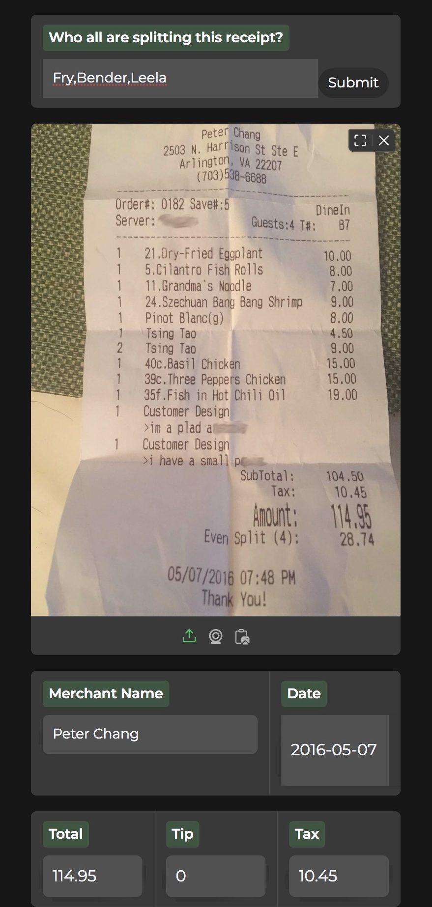 Tired of overpaying just because splitting the bill equally was easier? Now, pay only your fair share with this app! Snap a photo of your receipt, specify who had what, and let the app handle the rest. Handle tips, taxes, and if you're feeling a little charitable, credit card cashback as well!